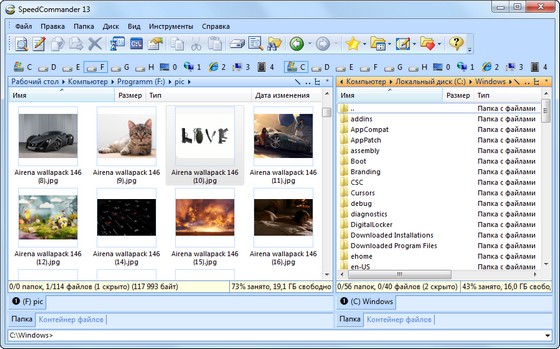SpeedCommander - файловый менеджер с многочисленными, в том числе и уникальными, возможностями по работе с файлами. Из не совсем обычных функций имеет смысл обратить внимание на мощную систему шифрования файлов (файлы сжимаются - внутренняя поддержка ARJ, ZIP, LHA, RAR, CAB, ACE, GZIP, TAR и UUE, затем шифруются по стойкому алгоритму DES, а потом ещё и их названия можно защитить паролем). Кроме этой довольно редко встречаемой опции, в SpeedCommander имеется встроенная поддержка просмотра около восьми десятков графических и текстовых форматов; есть полнофункциональный текстовый редактор с подсветкой синтаксиса и не менее полнофункциональный FTP-клиент.