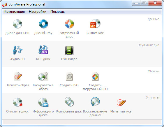 BurnAware Professional - компактная и простая в использовании программа для записи файлов на CD, DVD, Blu-Ray и HD-DVD диски. Поддерживает работу с любыми типами оптических дисков (включая CD-R/RW, DVD-R/RW, DVD+R/RW, BD-R/RE, HD-DVD-R/RW и DVD-RAM) и аппаратными устройствами записи. Есть возможность создания образов, записи мультисессионных дисков, проверки записанного содержимого.