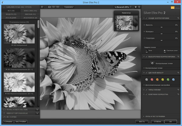 Silver Efex Pro позволяет выполнить изменение, а лучше сказать превращение, стилизацию современных цифровых фото-изображений, под стильные черно-белые фото-снимки. В арсенале Silver Efex Pro для пользователей не желающих вникать в суть процесса преобразования изображения — большое количество пресетов, (более 80) которые позволят получить приличный результат. U Point технология позволит Вам работать с отдельными зонами изображения: обработать лицо, глаза, фон и т.д. одновременно, но с различными настройками, установив контрольные точки в любой зоне, в любом количестве, с любым радиусом области действий (в пределах рабочего стола).