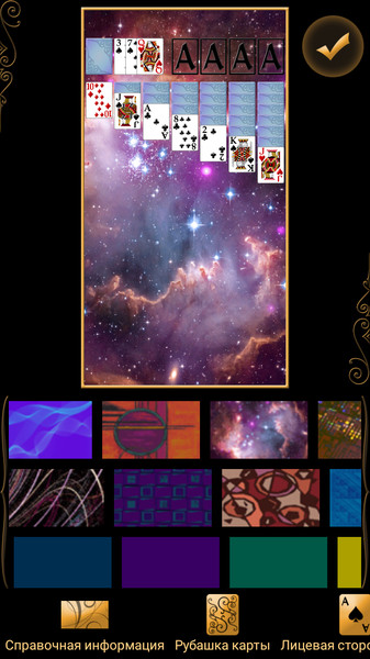Косынка (обычный пасьянс), Свободная ячейка, Гольф, Кэнфилд, Сорок разбойников, Площадь покера, Боулинг, Пирамида, Три вершины, Паук, Казино Клондайк (пасьянс Вегас), Юкон, Скорпион, Три башни, Суровый, Часы, Расчет, Русский, Китайский, Тузы сверху, Кошка, Осмос, Монте-Карло, Исчезающий крест, Монтана - Пагубная страсть, Красавица Люси, Шкатулка, Воздушный змей, Чередование, Терраса, Уголок королей, Алжирский пасьянс, 8-off, Бристоль, Картинная галерея, Американская жаба, Белая голова, Полумесяц, Осажденный замок, Восточная гавань и многие другие...