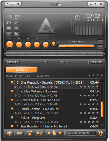 AIMP - программа, которая разрабатывалась как аналог всем известного медиаплеера Winamp. Программа позволяет воспроизводить без плагинов множество форматов, включая WAV, MP3, MP2, MP1, OGG, WMA, UMX и многие другие. Интерфейс программы выглядит очень стильно, а также имеет многоязычную поддержку, включая русский язык.